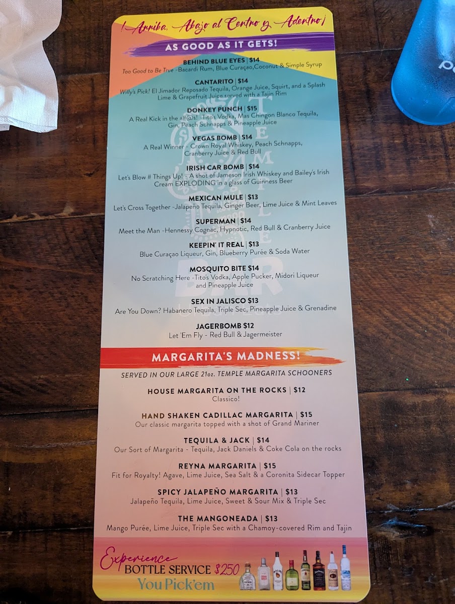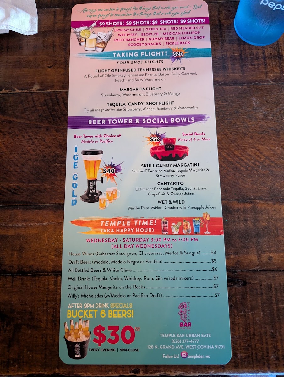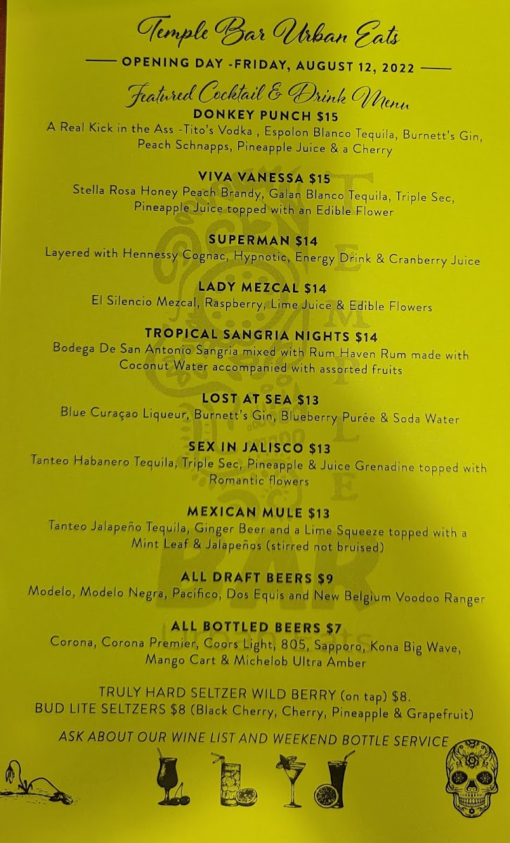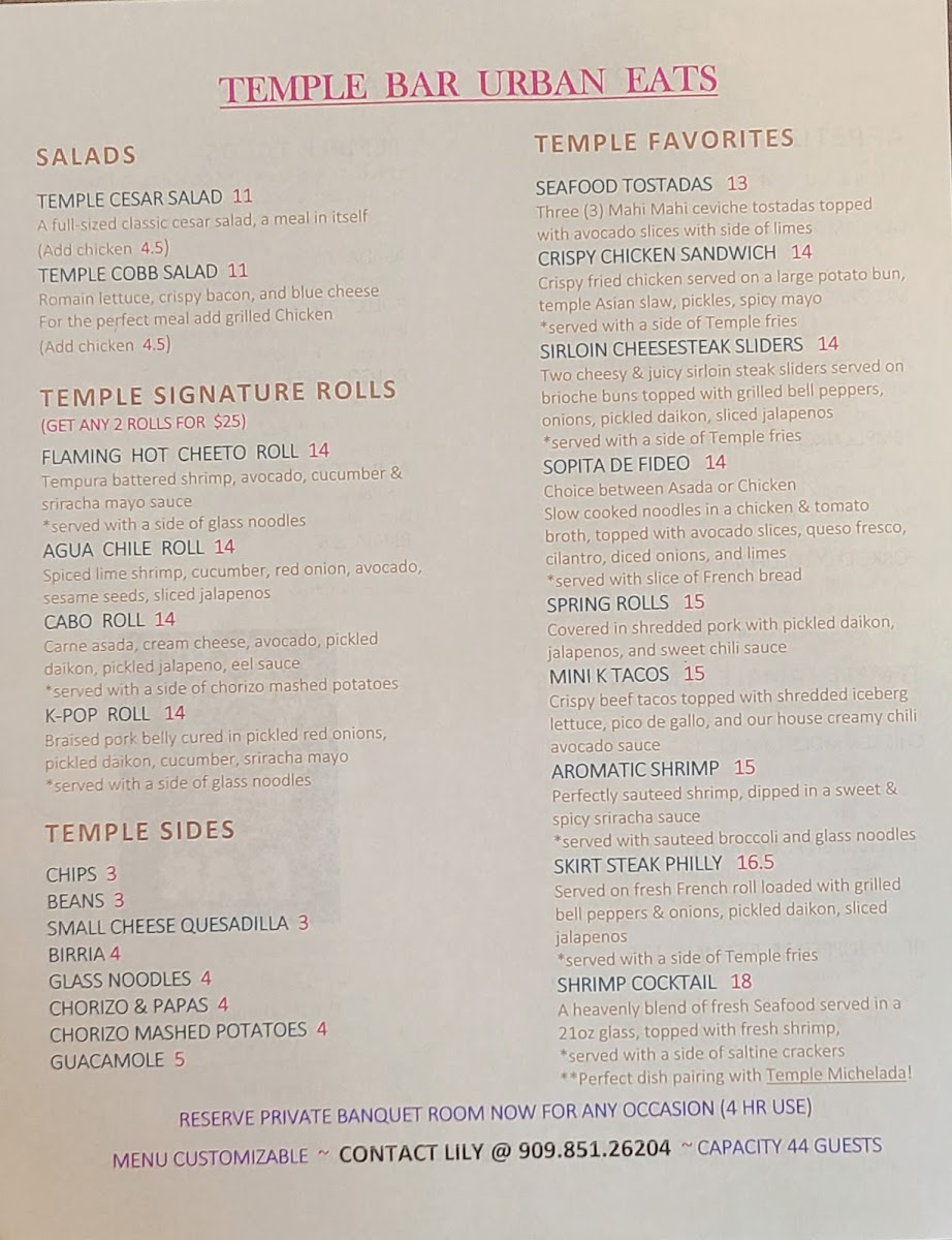 From a reviewer’s perspective, the menu at Temple Bar Urban Eats is a well-rounded reflection of the restaurant’s urban, multicultural identity, bringing together comfort food, Mexican classics, and Asian-inspired favorites in a way that feels both accessible and satisfying. To close out the dining experience, the beverage selection keeps things simple and refreshing with options like Flat Water, Fuji, Perier Sparkling Water, Soda Water, Mineragua, and juices including Cranberry Juice, Ginger Ale, Orange Juice, Pineapple Juice, and Red Bull (Can)-perfect companions to the bold flavors found throughout the menu.