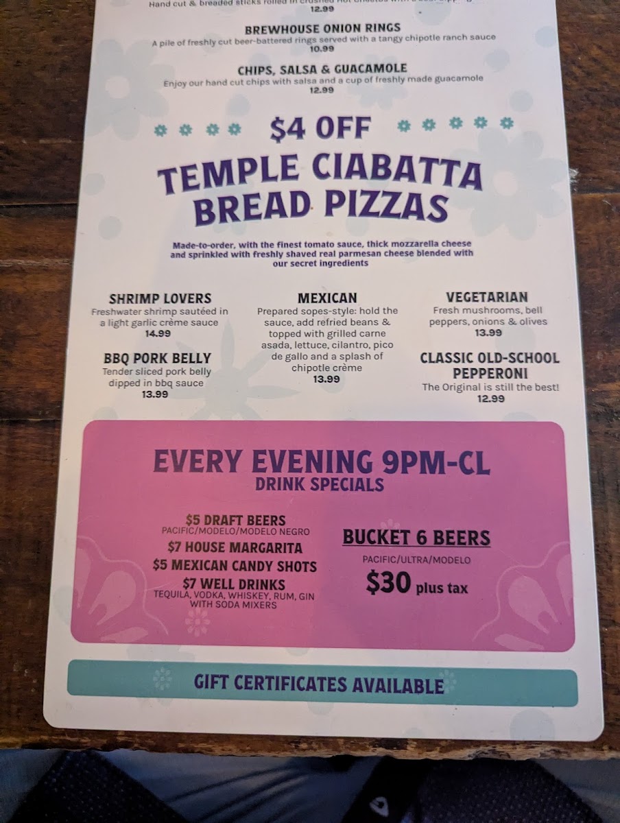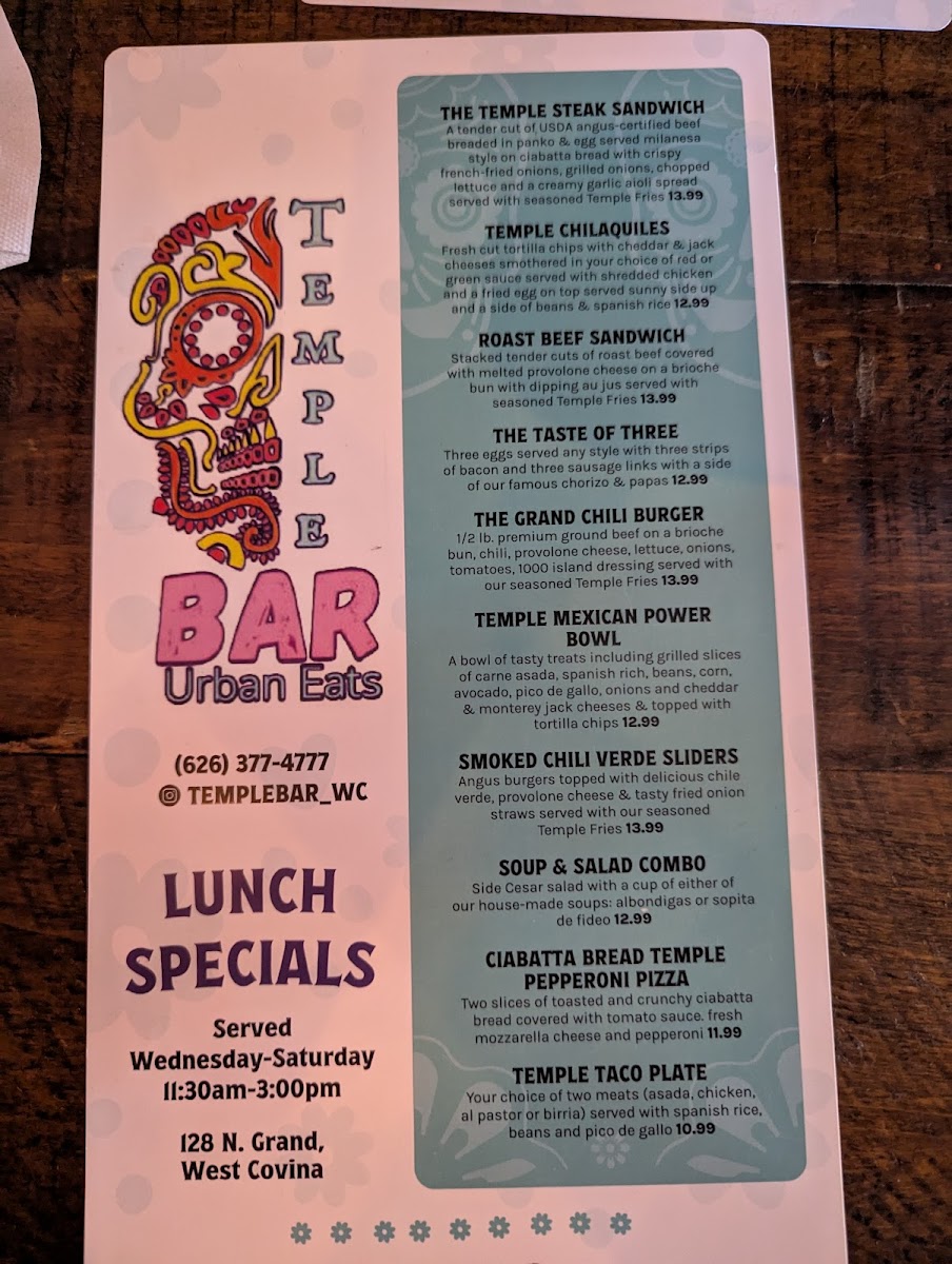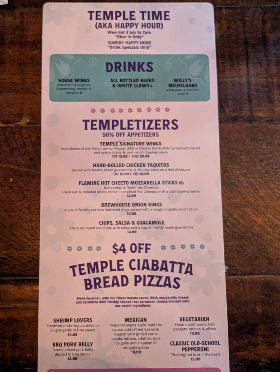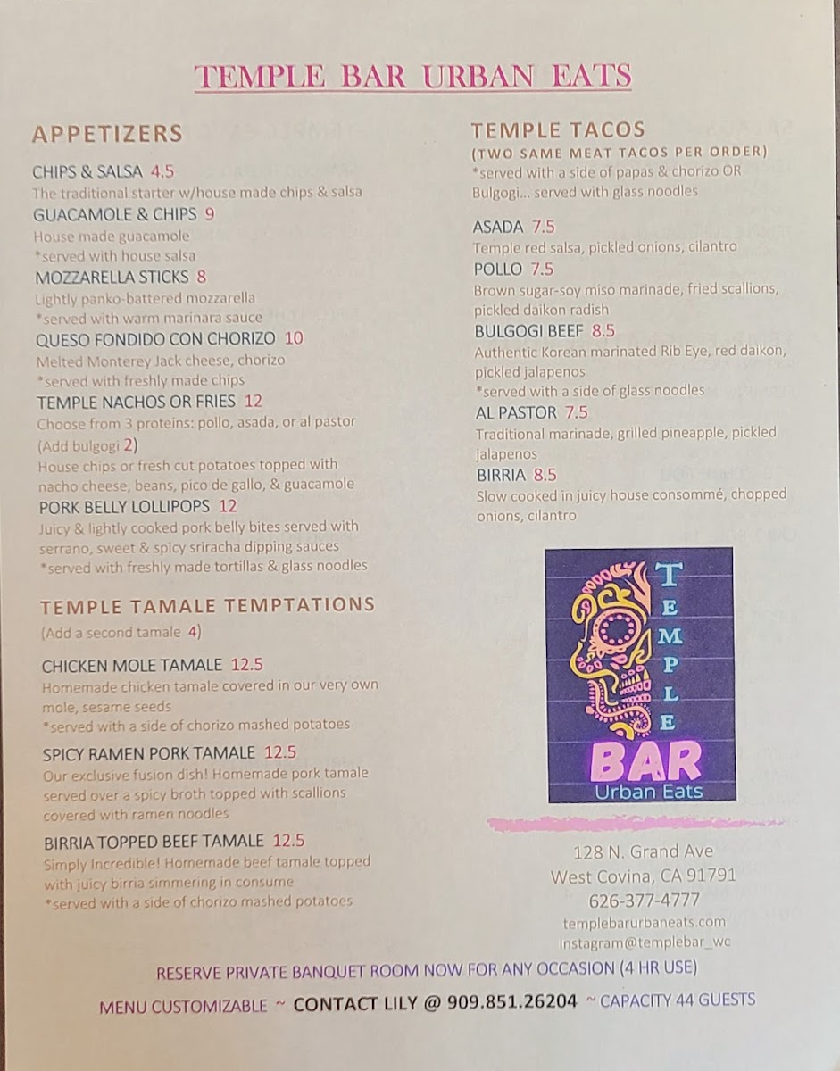 Looking at the full menu, appetizers like Brewhouse Onion Rings, Calamari, Chips & Salsa, Guac, and Salsa & Chips set a strong opening. Soups such as ALBONDIGA and SOPITA DE FIDEO bring comforting, homestyle flavors, while the Asian Favorites-Beef Lo Mein, Flaming Hot Cheeto Roll, Korean Short Rib Bowl, Shrimp Bowl, and Spicy Ramen Pork Tamale-add an unexpected but welcome layer of variety. The Taste of Mexico section stands out with dishes like BIRRIA BEEF TAMALES (2), CABO ROLL, CHILI VERDE BOWL, Junior's Stuffed WET TAQUITO BURRITO, and MEXICAN STEAK PLATE, all of which reinforce the restaurant’s Mexican roots. Finally, Temple Sides such as 1 Jalapeno Slices, 1/2 Avocado Slices, 1/4 Avocado Slices, 4 Lime Slices, and Guacamole neatly round out the menu, making it clear that Temple Bar Urban Eats is a place where variety, comfort, and bold flavor come together seamlessly.