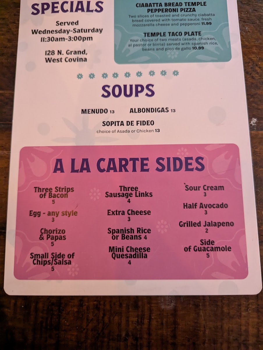The lunch specials highlight the kitchen’s versatility, with hearty bowls such as the MEXICAN POWER BOWL and Teriyaki Chicken/Veggie BOWL offering balanced, filling options. Sandwich and burger lovers are well taken care of with choices like CHILI VERDE SLIDERS, GRAND CHILI BURGER, ROAST BEEF SANDWICH, and TEMPLE STEAK SANDWICH, each designed to deliver big flavor in a casual format. Traditional Mexican comfort shines through the chilaquiles selection-Chilaquiles OVER EASY EGG, Chilaquiles SCRAMBLED EGG, and Chilaquiles NO EGG-while the PEPPERONI CIABATTA PIZZA adds a familiar, crowd-pleasing twist. Smaller add-ons such as 1 EGG, 1/2 AVOCADO SLICED, 1 GRILLED JALAPENO, 3 BACON, and 3 SAUSAGE LINKS allow diners to customize their meal with ease.